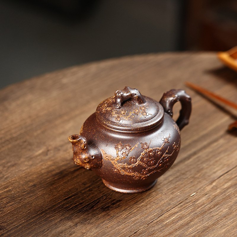 Họa tiết hoa mai tinh xảo: Trên thân ấm, họa tiết hoa mai được chạm khắc tinh xảo, là điểm nhấn chính tạo nên vẻ đẹp cổ điển cho sản phẩm. Hoa mai, biểu tượng của mùa xuân, mang đến sự tươi mới và may mắn, là lời chúc tốt lành cho những ai sở hữu chiếc ấm này. Mỗi cánh hoa, mỗi đường nét đều được chạm khắc tỉ mỉ, tạo nên một bức tranh sống động trên bề mặt ấm.