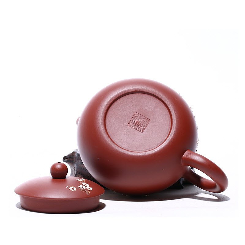 Hoa mai – biểu tượng của sự thanh khiết và may mắn, được khắc nổi tinh tế trên bề mặt ấm, tạo nên một điểm nhấn nghệ thuật độc đáo. Họa tiết hoa mai trắng trên nền đỏ của đất Đại Hồng Bào tạo nên sự tương phản hài hòa, mang lại vẻ đẹp thanh lịch, nhẹ nhàng nhưng không kém phần sang trọng. Sự hiện diện của hoa mai không chỉ làm tăng thêm giá trị thẩm mỹ cho chiếc ấm mà còn mang theo ý nghĩa văn hóa về sự tươi mới và may mắn khi xuân về.