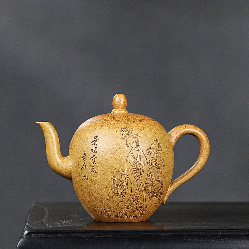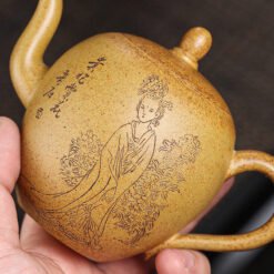 Ấm tử sa MNK003 sở hữu dáng ấm Mỹ Nhân Kiên lấy cảm hứng từ đường cong quyến rũ của mỹ nhân cổ đại, được chạm khắc tỉ mỉ hình ảnh quý phi thưởng hoa. Dung tích của ấm là 240ml, đủ lớn để sử dụng trong những buổi trà nhỏ, nhưng cũng vừa vặn để giữ cho trà luôn ấm và đậm đà.
