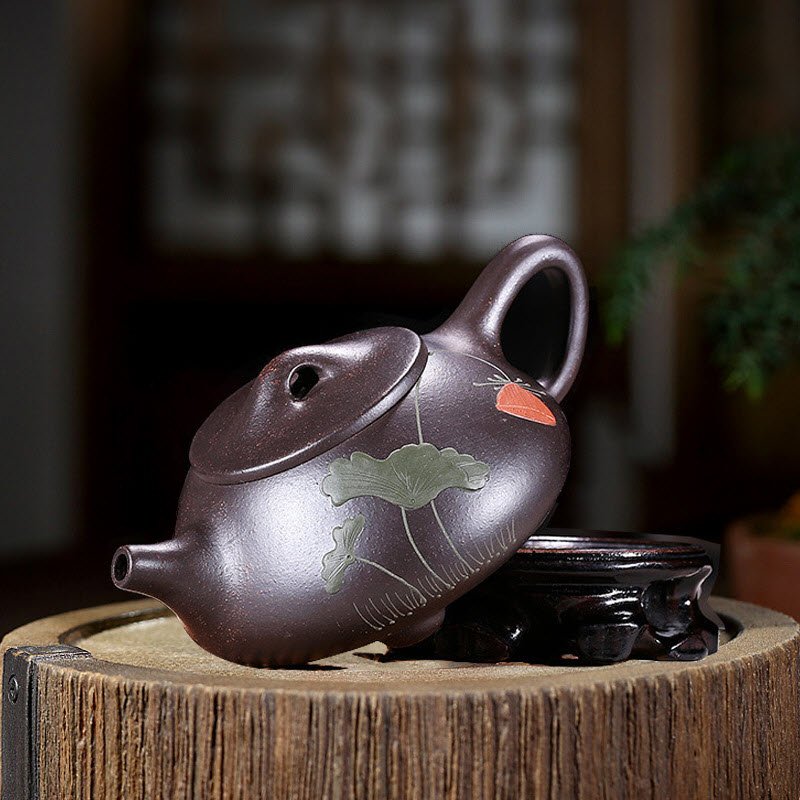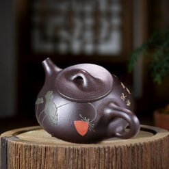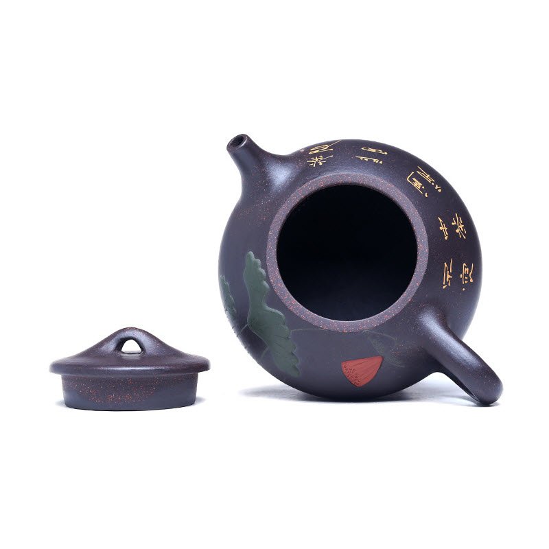 Ấm trà này có họa tiết đắp nổi hoa sen, còn 1 bên là câu thơ về hồ sen. Bạn có thể thấy cỏ cây và hoa sen mọc xanh và uyển chuyển trong khi uống trà. Dung tích ấm là 250ml, phù hợp để pha trà cho một số lượng người uống vừa phải hoặc để thưởng thức trà một cách riêng tư.