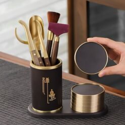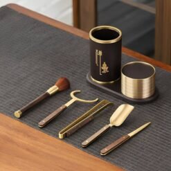 Bộ sản phẩm bao gồm 6 món công cụ, mỗi thành phần đều được thiết kế để phục vụ nghi thức pha trà truyền thống. Được sử dụng để gắp lá trà hoặc bỏ trà vào chén một cách đặc biệt tinh tế. Chất liệu bọc đồng tăng thêm sự sang trọng.
