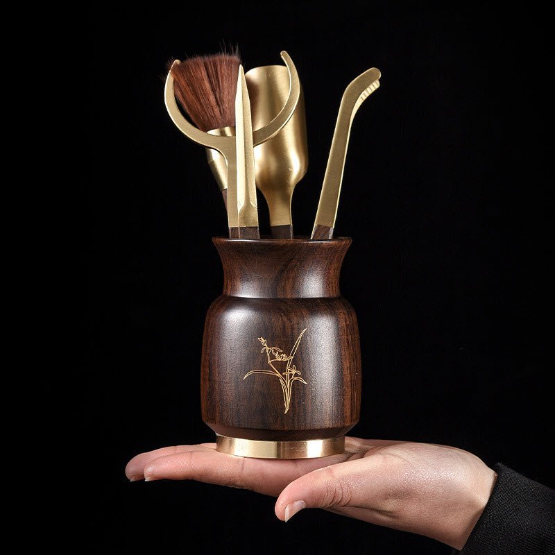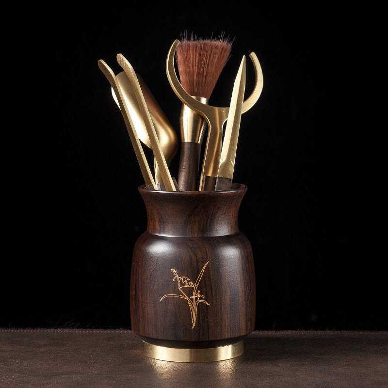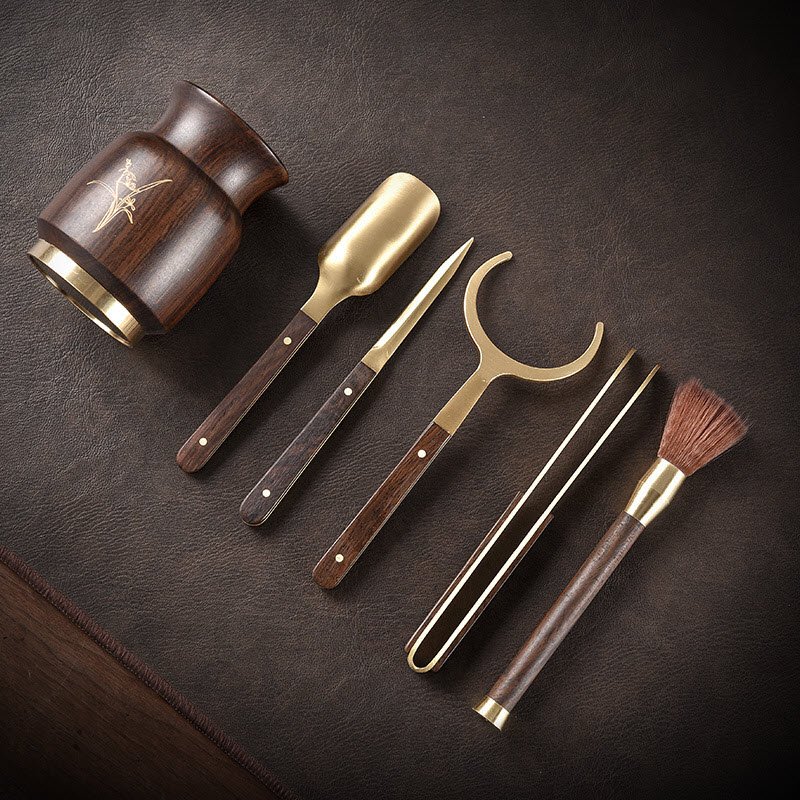 Bộ TC006 gồm 5 món công cụ tinh xảo, được thiết kế để phù hợp với tất cả các nghi thức trà đạo truyền thống. Gỗ gụ cao cấp được kết hợp với các chi tiết đồng, hoa văn được chạm khắc công phu.