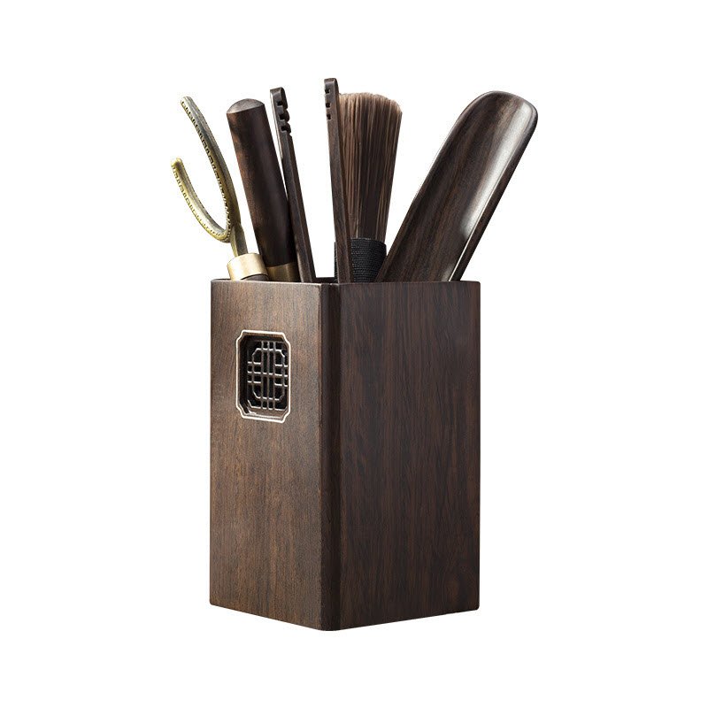 - Đặc điểm: Bao gồm 5 dụng cụ, chế tác từ gỗ hương, gỗ mun sừng kết hợp với đồng nguyên chất